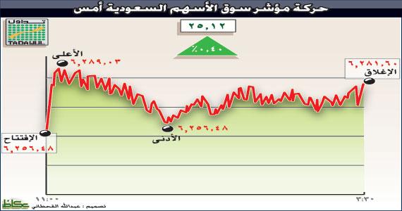 واصل المؤشر العام لسوق الأسهم السعودية أمس رحلة السير داخل المسار الصاعد الذي بدأه من عند مستوى 6184 نقطة، كأقل خط يسجله في موجة الهبوط الأخيرة، لينهي تعاملاته اليومية في المنطقة الإيجابية وعلى نفس الخط الذي أشرنا إليه في التحليل اليومي والمحدد عند مستوى 6282 نقطة، محققا مكسبا بمقدار 25 نقطة، أو ما يعادل 0.40 في المائة. ولعبت الصناديق البنكية دورا في الارتفاع من خلال الأسهم المؤثرة في المؤشر العام بهدف تحسين صورتها أمام العملاء، وذلك بالتزامن مع الإغلاق الأسبوعي للسوق.