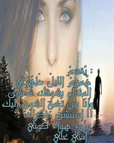 يٌقسمُ : هٌمومْ الليلْ ظَهَْريِ المثقل بشوقك نصفين وانَا مِن تًخمةِ الشوقِ إليِكَ اسْتنشقُ ذكراكَ !! ملءْ هواءٌ كَونْيِ .. إِنجْيِ عَليِ . |