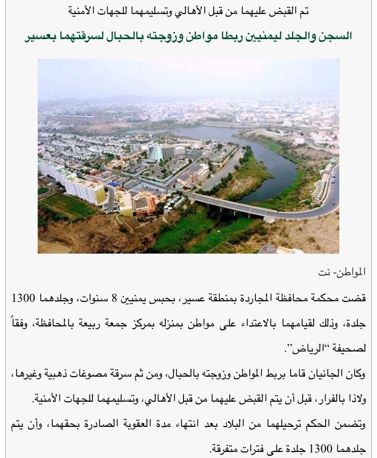 السجن والجلد ليمنيين ربطا مواطن وزوجته بالحبال لسرقتهما بعسير (المواطن) #عسير #السعودية https://pbs.twimg.com/media/B0yJD21CMAE-895.jpg:large |