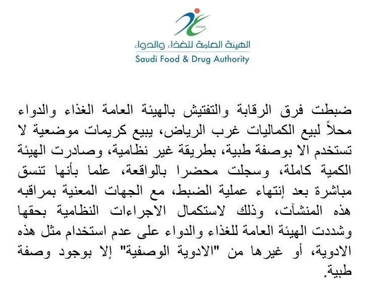 هيئة الغذاء والدواء تصادر “كريمات موضعية”، تباع بطريقة غير نظامية، في محال لبيع “الكماليات” بـ #الرياض . https://pbs.twimg.com/media/BziPOjQCMAAEC0N.jpg:large |