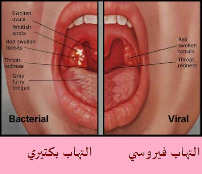 حلق، حرارة وصعوبات في الابتلاع. رغم ان صورة الالتهاب الفيروسي مميزة، لا يمكن دائما التفريق بشكل قاطع بينها وبين الالتهاب الجرثومي فقط بالاعتماد على الاعراض السريرية، وعندها يجب القيام بفحوصات اضافية لتحديد التشخيص النهائي.