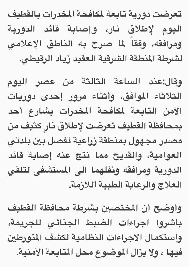 تعرض رجال أمن لإطلاق نار عند نقطة تفتيش #طبرجل، فيما لم يتم القبض على الجاني (سبق)