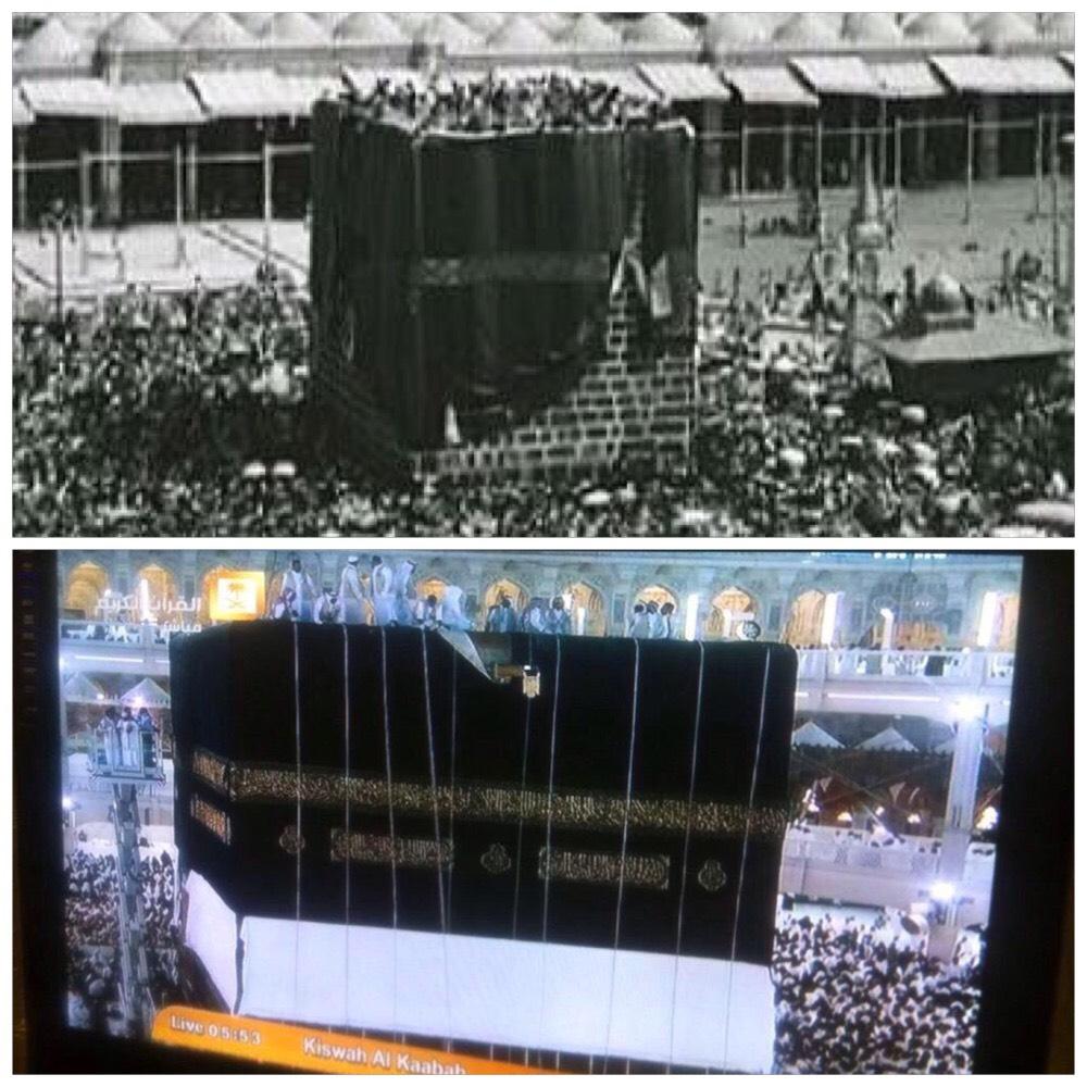 صورتين الأولى قديمة والثانية قبل قليل لـ #تبديل_كسوة_الكعبة .. وهذا من التشريف والتبجيل لبيت الله الحرام.