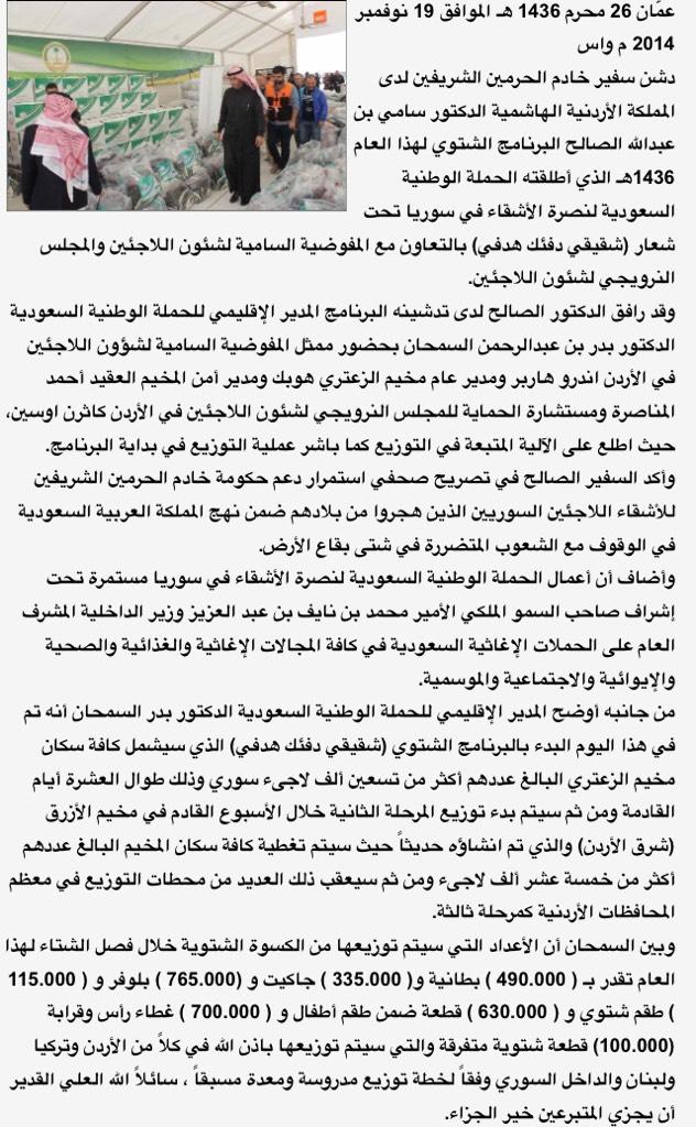 سفير #خادم_الحرمين_الشريفين في #الأردن يطلق البرنامج الشتوي لحملة #السعودية (شقيقي دفئك هدفي)لنصرةالأشقاء في #سوريا