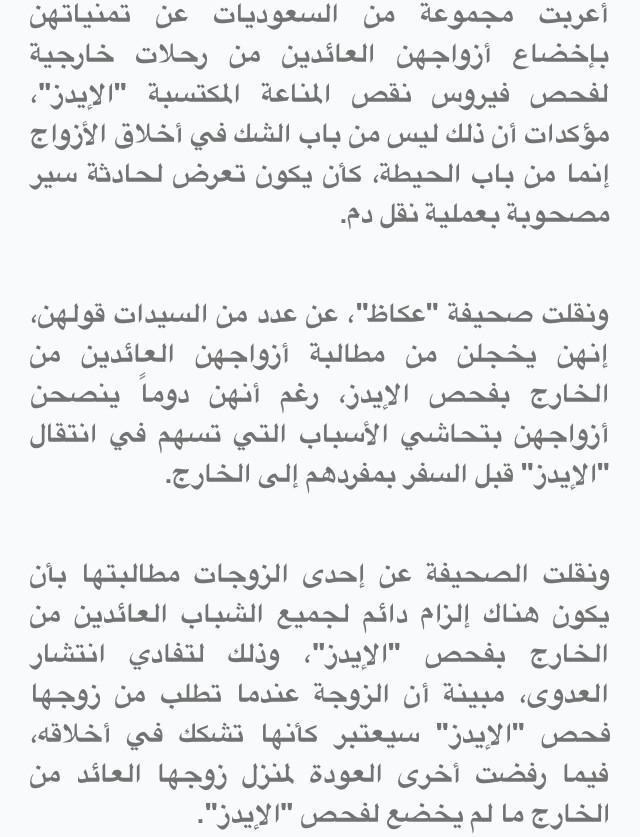 سعوديات يطالبن بإخضاع الأزواج العائدين من رحلات خارجية لفحص "الإيدز"