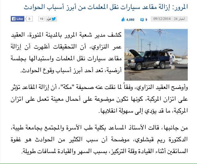 "المرور": إزالة مقاعد سيارات نقل المعلمات واستبدالها بجلسة أرضية من أبرز أسباب الحوادث. (مكة)