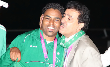 رفع الأمير نواف بن فيصل الرئيس العام لرعاية الشباب رئيس اللجنة الأولمبية العربية السعودية رئيس الاتحاد السعودي لذوي الاحتياجات الخاصة التهنئة لخادم الحرمين الشريفين الملك عبدالله بن عبدالعزيز آل سعود ولنائبه صاحب السمو الملكي الأمير سلمان بن عبد العزيز آل سعود - حفظهما الله - بمناسبة تحقيق لاعب المنتخب السعودي لذوي الاحتياجات الخاصة هاني حسين النخلي الميدالية الفضية في رمي القرص بدورة الألعاب «البارالمبية» المقامة حالياً في لندن. وأرجع سمو الرئيس العام لرعاية الشباب الإنجاز إلى توفيق الله سبحانه تعالى ثم للدعم الذي يجده جميع أبناء المملكة بمختلف فئاتهم من قيادتنا الرشيدة، مؤكداً أن تحقيق البطل النخلي هذه الميدالية يؤكد جدارة أبناء المملكة من ذوي الاحتياجات الخاصة واعتلاءهم منصات التتويج في المحافل الرياضية التي شاركوا بها كافة. وكان سمو الرئيس العام قد أجرى اتصالاً هاتفياً أمس برئيس بعثة المملكة لدورة الألعاب البارالمبية الدكتور ناصر الصالح وباللاعب هاني النخلي هنأهم خلاله بهذا الإنجاز العالمي، متمنياً التوفيق لبقية لاعبي المملكة في المنافسات المقبلة في الدورة.