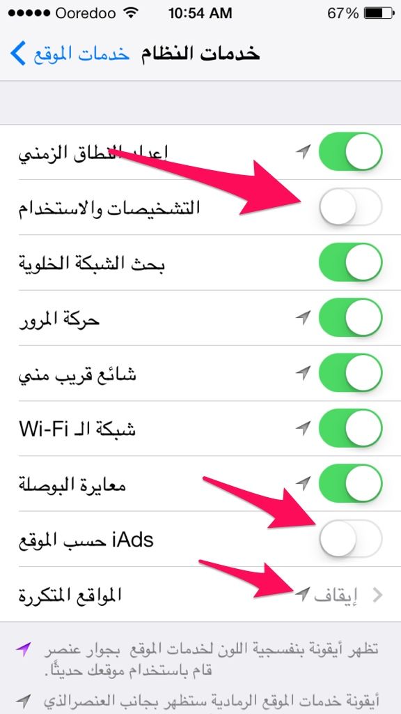 الاعدادات >> الخصوصية >> خدمات الموقع >> خدمات النظام ويقفل الاعدادات الموضحه في الصوره