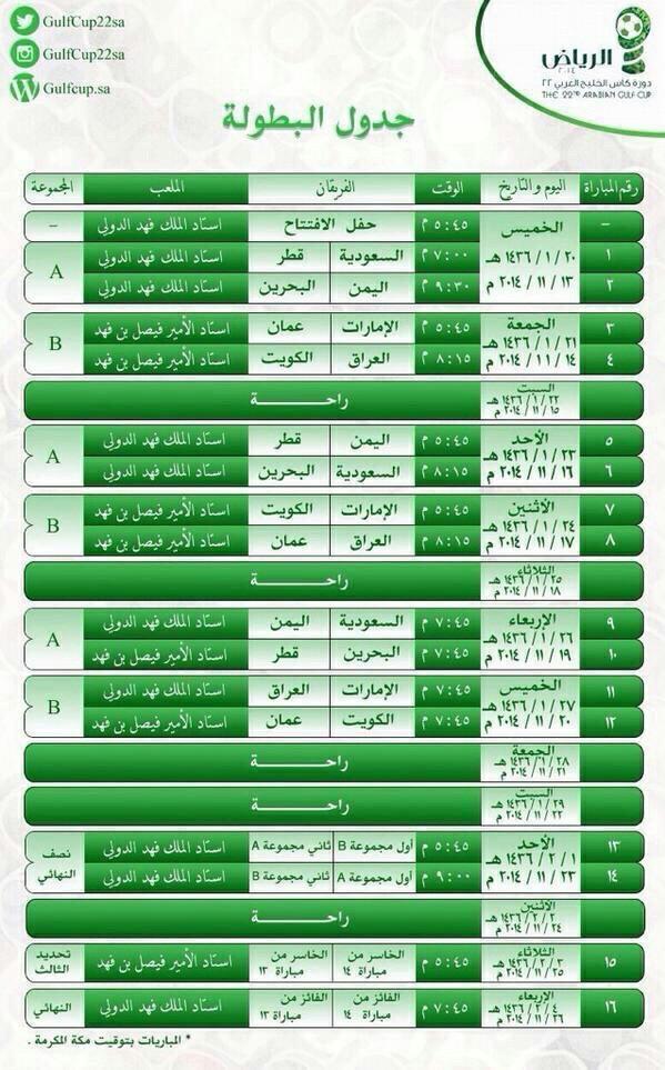 سبق حائل ــ فرحان المسمار : يسر سبق الجميع " سبق حائل " أن تقدم لكم جدورل كأس الخليج " 22 " والتي تنطلق يوم الخميس القادم على استاد الملك فهد الدولي بالرياض وأيضا زمن انطلاق كل مبارة بتوقيت مكة المكرمة . ![]() |