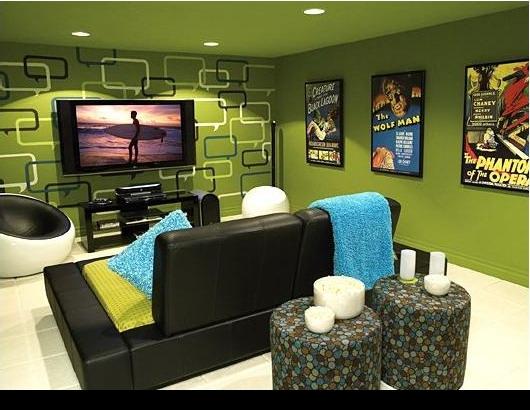 غرفة المعيشة حيوية جدا مع اللعب بالإضاءة ودرجات اللون الأزرق الفيروزي أو التركواز