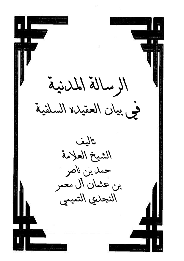 فهذه رسالة شرحت إعتفاد أهل السنة والجماعة في باب الأسماء والصفات حررها الشيخ حمد بن ناصر آل معمر رحمه الله تعالى وهي إجابة عن رسالة بعثت إليه من المدينة النبوية يطلب فيها السائل الإجابة عن معتقد الشيخ محمد بن عبدالوهاب في باب الأسماء والصفات .. وفق الله الجميع للعلم النافع والعمل الصالح