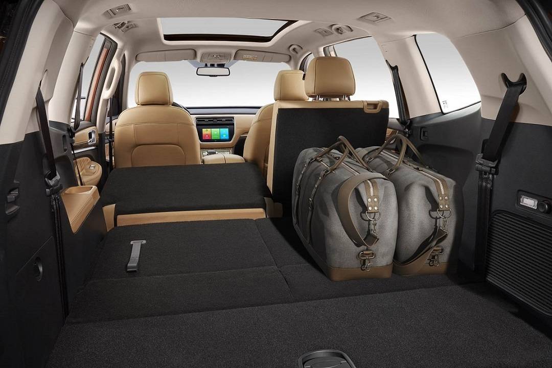فتح صندوق الأمتعة سهل ويتوفر بخيار كهربائي والمساحة المخصصة للأمتعة بالخلف صغيرة عند استخدام الصف الثالث ( 70 لتر ) وبالإمكان زيادة هذا المساحة بطي المقاعد الخلفية .